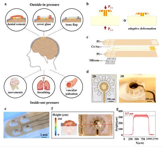 現(xiàn)有的研究大多聚焦于通過材料來讓電極與組織實現(xiàn)保形接觸,可電極-組織的緩沖接觸卻常被冷落。就像在實驗動物中,常用牙科水泥固定柔性薄膜電極,或者用蓋玻片作觀察窗,還有原始骨瓣密封法。但這些方法中的剛性蓋板,都會給下方的軟腦組織帶來壓力,炎癥或組織損傷的風(fēng)險如影隨形。后來,有研究人員嘗試添加明膠壓縮海綿等,或用軟人造硬腦膜代替剛性玻璃,可由內(nèi)而外的壓力同樣不可小覷,顱內(nèi)壓變化和腦微運動導(dǎo)致的電極-組織相互作用依舊棘手。