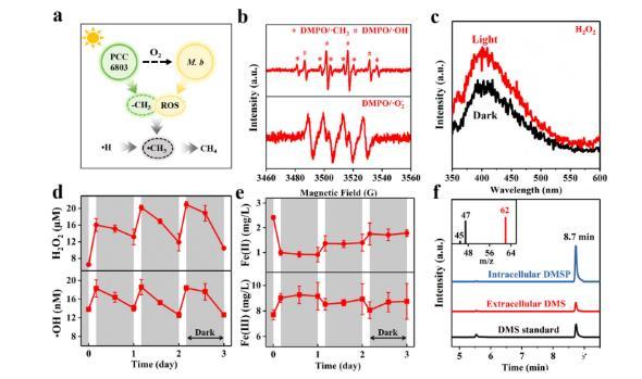 圖4、PCC6803-M.b-Fe-EDTA的非生物甲烷生成。a)使用PCC6803-M.b-Fe-EDTA的非生物甲烷生成示意圖。b)?CH3、?OH和?O2-的EPR譜圖。c)使用o-tolidine作為過氧化物指示劑的H2O2的UV/Vis吸收譜圖。d-e)H2O2和?OH(d),以及Fe(II)和Fe(III)(e)濃度的典型時間變化。灰色區(qū)域表示黑暗期。f)表征DMS和DMSP作為甲基供體(插圖顯示了DMS的質(zhì)譜圖)。