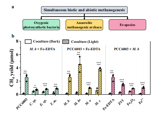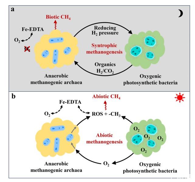 圖1、氧合光合細(xì)菌存在下的甲烷產(chǎn)生示意圖。a)無氧條件下黑暗中的合成共生甲烷生成。b)光照條件下氧氣存在下的非生物甲烷生成。