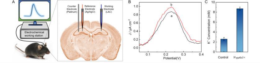 本研究設計并應用了線性范圍可控的適配體修飾微電極,用于活體腦中K?的實時檢測。設計了三種不同鏈長的K?適配體,其中3′末端炔基用于錨定適配體探針于電極表面,5′末端二茂鐵作為電化學響應信號反映K?變化。發現隨著適配體鏈長的增加,微電極對K?檢測的線性響應范圍逐漸向高濃度移動。具有最長修飾鏈的LAC在10μmol·L?1–10 mmol·L?1范圍內呈現線性響應,滿足實際活體腦檢測需求。最終,LAC成功應用于缺氧后小鼠腦內K?的體內檢測。所開發的合理調節適配體修飾傳感器響應范圍的策略,可能為拓寬適配體傳感器在不同測量系統(尤其是腦分析)中的應用開辟新途徑。