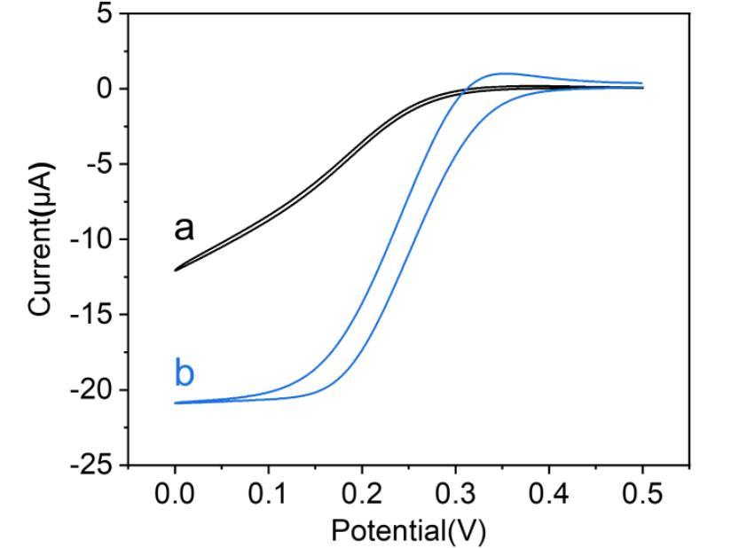 其中Q為消耗電荷,單位面積清潔金電極的Q值為386μC·cm?2。計算得AuS/GO的電化學活性面積為0.05 cm2,約為裸CFME幾何面積的7.8倍。在1.0 mmol·L?1K?[Fe(CN)?]中的CV曲線(圖2)顯示“S”形特征電流峰,表明其具有典型微電極特性。此外,AuS/CFME的極限擴散電流比裸CFME高2.4倍,這可能源于增大的電化學活性面積(圖2曲線b)。