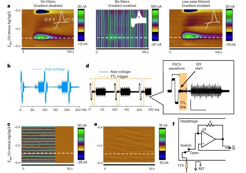 相較于EEG-fMRI融合,FSCV與fMRI的同步面臨更為復雜的技術挑戰。一方面,電化學測量設備的金屬組件可能在MRI高磁場環境中產生渦流效應,干擾圖像質量并引發組織灼傷風險;另一方面,FSCV的快速電勢掃描(通常為400 V/s)可能與MRI梯度脈沖產生電磁耦合,導致神經化學信號失真。此外,兩種技術的時間分辨率差異(FSCV可達毫秒級,fMRI為秒級)也增加了數據對齊的難度。