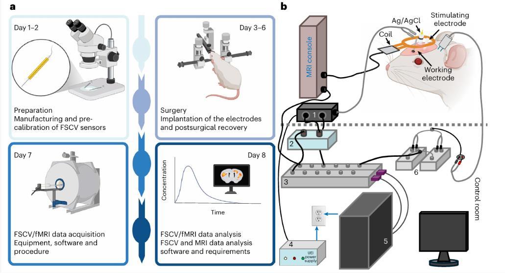 北卡羅來納大學教堂山分校的Tatiana A.Shnitko、Yen-Yu Ian Shih團隊在《Nature Protocols》發表的創新性研究,提出了一套將快速掃描循環伏安法(FSCV)與fMRI深度融合的實驗協議,首次實現了活體動物腦內神經化學動力學與全腦血氧水平依賴(BOLD)信號的同步采集,為破解多模態整合難題提供了革命性解決方案。該方案通過磁共振兼容硬件設計、精準時序控制與多階段驗證體系,有效克服了偽影干擾、硬件沖突等技術瓶頸,為探索神經血管耦合機制及相關疾病病理生理過程開辟了新路徑。