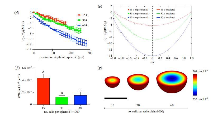 在對相應位置的氧分壓進行采樣后,這些數據被用于生成數學模型。由于球體內的間充質干細胞在向中心擴散的過程中會消耗氧氣,因此我們將這些數據與之前描述的同時消耗氧氣的擴散運輸質量轉移方程進行了擬合: