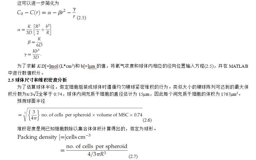 以前使用癌細胞和肝細胞進行的研究使用了氧微電極來測量它們的穩態氧值,而其他研究則生成了預測性數學模型,但無法直接測量氧分壓值來驗證模型。雖然已有大量建模研究致力于研究球體內的運輸現象,但之前的研究是針對以不同速度消耗氧氣和營養物質的非多介質細胞群體進行的。此外,間充質干細胞形成球狀體的意義與癌細胞和肝細胞大不相同,因為間充質干細胞在體內不會自然形成球狀體,而是作為一種工具,使細胞能夠最大限度地分泌營養因子。最后,不同類型細胞的堆積密度和孔隙率不同,導致擴散速度也不同。