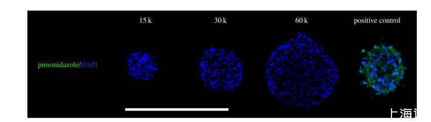 圖5缺氧組織學(xué)分析表明,不同直徑的球體之間沒(méi)有明顯差異。Pimonidazole(綠色)和DAPI(藍(lán)色)染色進(jìn)一步驗(yàn)證了15000、30000和60000細(xì)胞球體內(nèi)沒(méi)有缺氧核心。一個(gè)60000細(xì)胞球體在1%氧氣中培養(yǎng)5天,作為皮尼達(dá)唑染色的陽(yáng)性對(duì)照(右圖)。刻度線代表500μm;圖像使用20×物鏡拍攝。