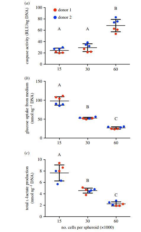 圖3細(xì)胞存活和葡萄糖消耗受球形大小的影響。(a)間充質(zhì)干細(xì)胞球體內(nèi)Caspase 3/7酶活性,(b)葡萄糖總消耗量,(c)L-乳酸總產(chǎn)生量。
