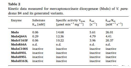 在本研究中,生成并表征了最近鑒定和表征的V.paradoxus B4巰基琥珀酸雙加氧酶的酶變體,以闡明對酶活性和底物配位重要的氨基酸殘基。為此,通過定點誘變替換了Msdo的七個不同氨基酸殘基。