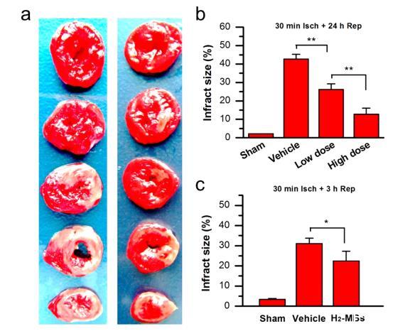 然后,我們調查了不同劑量的H2-MBs對心肌缺血再灌注損傷后梗死面積的影響。大鼠經歷30分鐘的缺血和24小時的再灌注。左冠狀動脈(LCA)閉塞后,通過心電圖(ECG)S-T段抬高確認缺血(圖S6),然后在再灌注前將H2-MBs或載體以低劑量(4×109個泡沫)或高劑量(2×1010個泡沫)濃度注入尾靜脈。圖3a顯示了載體或H2-MB(高劑量)處理的大鼠的代表性橫截面。評估梗死面積顯示,高劑量H2-MBs顯示出比低劑量H2-MBs更顯著的細胞保護作用(P<0.01)(圖3b)。接受高劑量H2-MBs的大鼠顯示出12.81±3.21%的梗死面積,而與接受載體處理的大鼠(INF/LV:42.67±2.60%)相比,梗死面積減少了69.97%。相比之下,接受低劑量H2-MBs的大鼠顯示出較少的細胞保護作用,梗死面積為26.21±3.10%,僅減少了38.57%。我們還檢查了高劑量H2-MBs對經歷30分鐘缺血和3小時再灌注的大鼠的保護作用,梗死面積評估顯示梗死面積減少了28.06%(P<0.05)(圖3c)。