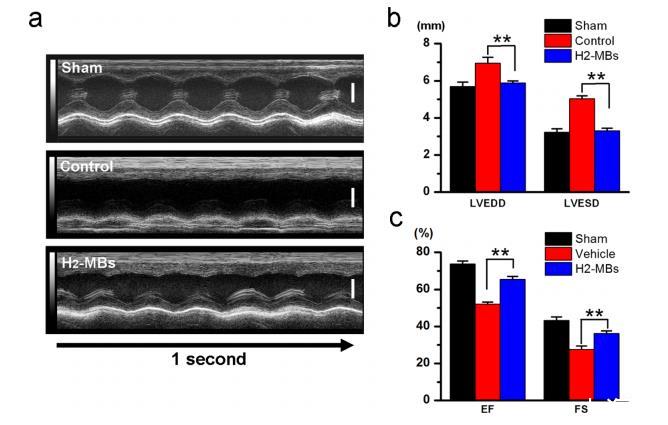 圖4.H2-MBs減少不良的LV重塑。(a)接受假手術處理(假手術)、缺血再灌注對照微泡處理或缺血再灌注H2-MBs處理的大鼠的代表性M模式超聲心動圖像。對每組的M模式超聲圖像的測量是在缺血再灌注后48小時進行的。使用裝備有MS-250掃描頭探頭的Vevo 2100系統(tǒng)進行成像,掃描速度為1000 Hz,頻率為21 MHz。刻度條(垂直),4 mm。(b)基于超聲心動圖像,確定了LV尺寸,包括左室舒張末期直徑(LVEDD)和左室收縮末期直徑(LVESD)(n=5)。**P<0.01。數(shù)據表示平均值±s.d。(c)與對照組相比,H2-MB處理的大鼠的心臟收縮功能(FS%)和射血分數(shù)(EF%)顯著改善(n=5)。**P<0.01。數(shù)據表示平均值±s.d。