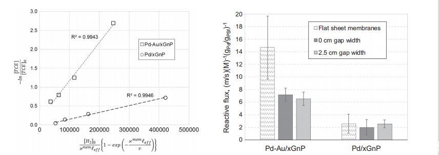 在Pd/xGnP/PSf和Pd-Au/xGnP/PSf膜的測試中,以0 cm間隙寬度鑄造的膜的平均反應通量分別為2.0±1.1和7.2±1.1(m/s)(MH2)-1(gPd/gPSf)-1。在以2.5 cm間隙寬度鑄造的Pd/xGnP/PSf和Pd-Au/xGnP/PSf膜的測試中,平均反應通量分別為2.5±0.6和6.5±1.2(m/s)(MH2)-1(gPd/gPSf)-1。在使用無催化劑的PSf和xGnP/PSf中空纖維膜的對照測試中,未觀察到TCE還原。