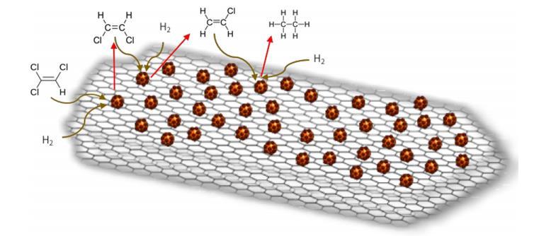 還原催化脫鹵的TCE預期路徑比總反應C2HCl3+4 H2→CH3CH3+3 HCl更復雜。首先,H2和TCE吸附到Pd或Pd-Au納米顆粒的催化活性位點上,其中H2吸附是解離的。催化反應可以進行,使得表面氫和TCE反應產生二氯乙烯(DCE)和HCl作為副產物。類似地,DCE和H2吸附到催化活性位點上,DCE被催化脫鹵為氯乙烯和HCl。最終脫鹵步驟是氯乙烯還原為乙烷。該還原路徑中的速率限制步驟是TCE催化脫鹵為DCE。這些步驟示意圖如圖6所示。