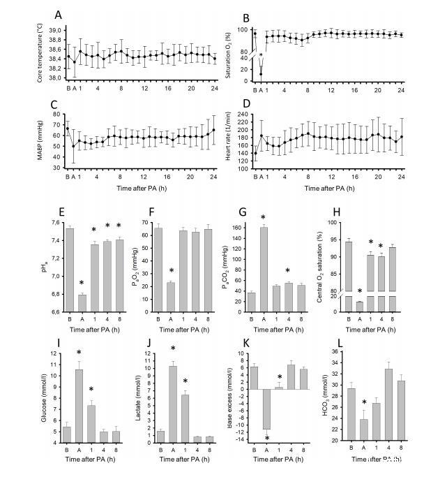 pHbrain的改變不僅在急性PA期間發揮重要作用,在復蘇/再氧合后也具有重要病理生理學意義。先前的研究報道仔豬在從PA恢復后pHbrain保持穩定,但未對恢復4小時后的情況進行隨訪。相反,我們當前的研究將窒息后觀察期延長至24小時。我們發現在該仔豬PA/HIE模型中,PA后24小時期間未出現pHbrain的重大繼發性改變。