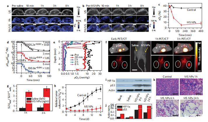 然后,在雙側4T1異種移植腫瘤小鼠身上評估了MS NPs作為體內DOA用于腫瘤饑餓療法的潛在資格,在右側腫瘤內注射MS NPs,在左側腫瘤內注射生理鹽水作為對照。通過多波長光聲(PA)和B型超聲(US)圖像的聯(lián)合注冊,實時定量監(jiān)測瘤內血氧飽和度(sO2)的變化,即血紅蛋白結合氧的水平。對照組的sO2值幾乎保持不變,約為37%,與注射前持平(圖5a,c),這證實了4T1實體瘤在此期間的輕微缺氧性質,以及生理鹽水本身對瘤內sO2的影響微乎其微。值得注意的是,從注射MS NPs十分鐘后開始,sO2就急劇下降,這種下降趨勢一直持續(xù)到三小時,瘤內血氧幾乎被完全清除(圖5b、c),這表明HbO2被有效脫氧。同時,金標準氧微電極顯示,腫瘤組織中溶解的游離氧也同樣被徹底清除(圖5d、e)。瘤內溶解氧原始微輪廓的明顯波動表明,實體瘤中的氧分布是不均勻的,而在注射MSNP后,這種不均勻性被大幅消除,達到了持久的零氧張力。從理論上講,細胞生長的有利微環(huán)境主要依賴于血紅蛋白結合氧和組織內溶解氧之間的平衡,因此腫瘤內這兩種氧的完全耗竭將不可避免地導致嚴重缺氧以及隨后的細胞壞死和凋亡。