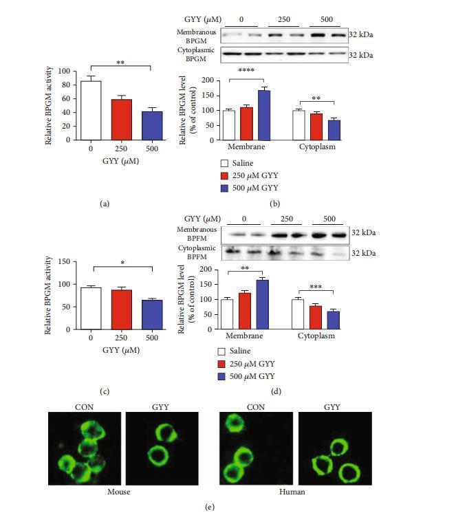 硫化氫通過抑制膜錨定的BPGM從膜向細胞質的釋放來抑制紅細胞2,3-BPG生成。BPGM是紅細胞中2,3-BPG生成的關鍵限速酶。在紅細胞中,糖酵解酶在膜與細胞質之間的轉運是調控細胞質糖酵解酶活性的關鍵機制。我們發現與野生型小鼠相比,Cse-/-小鼠的細胞質中BPGM活性增加(圖4(a))。與此一致的是,Cse-/-小鼠的細胞質中BPGM蛋白水平也顯著升高,而膜中BPGM蛋白水平顯著降低(圖4(b))。免疫熒光分析還顯示BPGM從細胞膜向在Cse-/-小鼠紅細胞的胞質中(圖4(c)),GYY4137處理顯著降低了胞質BPGM的活性和蛋白水平,同時提高了Cse-/-小鼠細胞膜上的BPGM含量(圖4(a)和4(b)),并誘導BPGM在Cse-/-小鼠紅細胞膜上發生錨定(圖4(c))。在小鼠(圖5(a)和5(b))及人類(圖5(c)和5(d))紅細胞培養模型中,GYY4137同樣表現出抑制胞質BPGM活性、提升膜上BPGM水平、降低胞質BPGM水平的特性。圖像分析證實,GYY4137可誘導BPGM從胞質向細胞膜的轉位(圖5(e))。