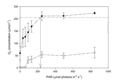 在組織表面測得的O?動態變化呈現出典型模式:隨著光照強度增加,健康組織的O?濃度先升后飽和,最終漸近趨近最大值(圖6)。通過這些曲線可估算補償光照強度Ec,即組織表面與周圍水體間雙層屏障(DBL)不存在氧氣梯度的光照強度。在此光照強度下,氧氣消耗與生成達到平衡,無凈交換;當光照強度超過Ec時,系統從凈異養狀態轉變為自養狀態。健康組織的這一轉變發生在更高光照強度(230 mol光子/m2/s)下,高于先前報道的珊瑚數據,這反映出珊瑚具有高光適應性(Acropora muricata的枝條生長于礁坪區域),因而呼吸速率較高。相比之下,褐帶組織表面的O?濃度顯著降低,由于纖毛蟲等成分的高呼吸作用,即使在最高光照強度下,其O?濃度也僅達到周圍水體的25%。在黑暗環境和最低光照條件下,褐帶組織表面幾乎呈現無氧狀態,表明氧氣供應存在跨DBL的擴散限制(圖6)。
