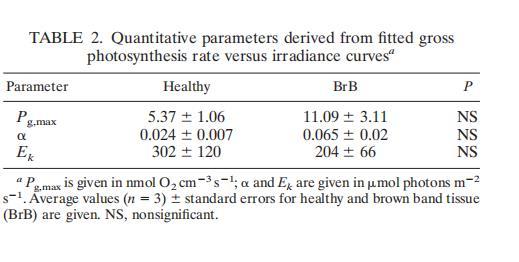 健康和褐帶組織之間的Fv/Fm沒有顯著差異,表明PSII活性沒有因纖毛蟲攝入而受到抑制。實際上,光利用效率,以有效PSII量子產量ΔF/Fm'為特征,顯然在與纖毛蟲關聯的蟲黃藻中增加了。