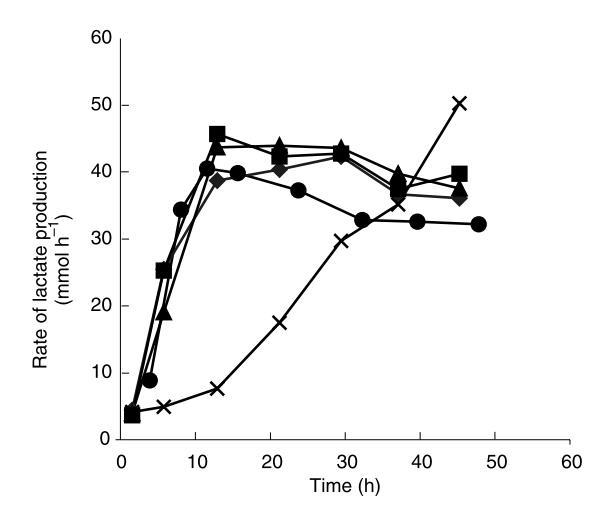 珠內(nèi)生物量濃度和流出物中乳酸濃度在同一間隔測定。珠內(nèi)細(xì)胞密度在發(fā)酵期間的時間過程如圖4所示,而觀察到的乳酸生產(chǎn)速率如圖5所示。