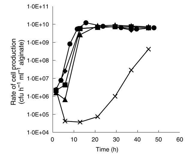 由于乳酸菌的生長伴隨乳酸生產(chǎn),不同尺寸珠的結(jié)果表明大多數(shù)乳酸菌生長位于珠最外部。由于珠最外層生物量濃度似乎穩(wěn)定,該區(qū)域的生物量生長可能釋放到周圍介質(zhì)中。根據(jù)先前研究,珠內(nèi)部生物量被未解離乳酸和低pH抑制。因此,升高周圍介質(zhì)pH可能用于影響珠內(nèi)生物量分布和隨后細(xì)胞釋放,通過促進(jìn)珠內(nèi)部生長和抑制外圍生長。為了研究這個想法,記錄了L.lactis亞種lactis在給定培養(yǎng)基中不同控制pH值下的生長速率。基于這些實(shí)驗(yàn),在固定化細(xì)菌連續(xù)發(fā)酵實(shí)驗(yàn)中使用以下pH值:6.5、8.50、8.75、9.00和9.25。所有發(fā)酵在發(fā)酵前2小時在pH 6.5下運(yùn)行,以在珠中建立保護(hù)性pH梯度。細(xì)胞釋放速率,監(jiān)測為自由細(xì)胞生產(chǎn)速率,在發(fā)酵期間各種間隔測定。每個發(fā)酵的自由細(xì)胞生產(chǎn)速率如圖3所示。