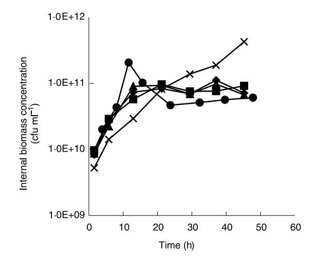 細(xì)胞釋放速率在發(fā)酵早期階段增加。在pH 6.50下運(yùn)行的發(fā)酵在連續(xù)發(fā)酵12-15小時后達(dá)到穩(wěn)態(tài)細(xì)胞釋放速率。在接下來33小時發(fā)酵期間僅觀察到細(xì)胞釋放速率的微小變化。這與連續(xù)發(fā)酵期間內(nèi)部生物量分布分析結(jié)果一致。