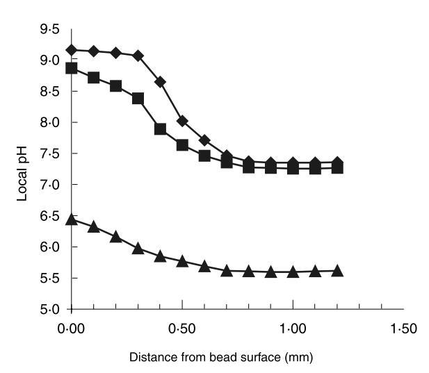 這些大變化背后的機(jī)制假定與珠內(nèi)pH梯度差異相關(guān)。從圖7可見,在pH 9.00和9.25下發(fā)酵22小時的珠最外部pH梯度有顯著差異。在珠內(nèi)部,局部pH似乎差異較小。盡管在高pH下發(fā)酵的珠中pH梯度更陡,但在高pH下發(fā)酵的珠中心局部pH僅比在pH 6.5下發(fā)酵的珠高1.7單位。