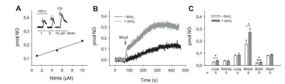 為了區分由組織特異性CA從亞硝酸鹽產生的NO和由其他途徑產生的NO,我們在沒有多佐胺和有多佐胺的情況下進行了化學發光分析,以檢測多佐胺是否對各組織產生的NO有顯著影響,多佐胺能與CA發生特異性反應,從而增強亞硝酸鹽產生NO的能力,如圖1所示。在所有組織中都能檢測到亞硝酸鹽產生的NO,這與之前的研究結果一致,血液、肝臟和大腦在存在多佐胺的情況下產生的NO顯著增加(圖3B和C)。特別是,在含有和不含多佐胺的血液中觀察到的高NO信號(圖3,B和C)表明,亞硝酸鹽依賴性NO的生成超過了血紅蛋白的NO清除能力,這與之前的觀察結果一致。由于單獨使用多佐胺對NO的生成沒有影響(圖1),多佐胺的這種增強效應表明,組織中(至少在血液、肝臟和大腦中)存在能夠催化亞硝酸鹽轉化為NO的功能性CA,盡管CA同工型和其他酶在生理條件下不同組織將亞硝酸鹽轉化為NO的能力中的相對作用仍有待解決。