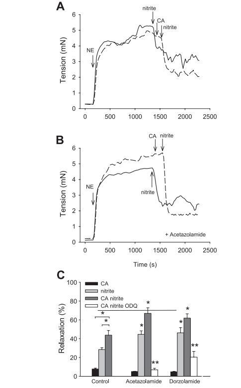 圖4亞硝酸鹽與CA反應產生的NO的血管活性以及乙酰唑胺、多佐胺和1H-[1,2,4]oxadiazolo[4,3a]quinoxalin-1-one(ODQ)的影響。