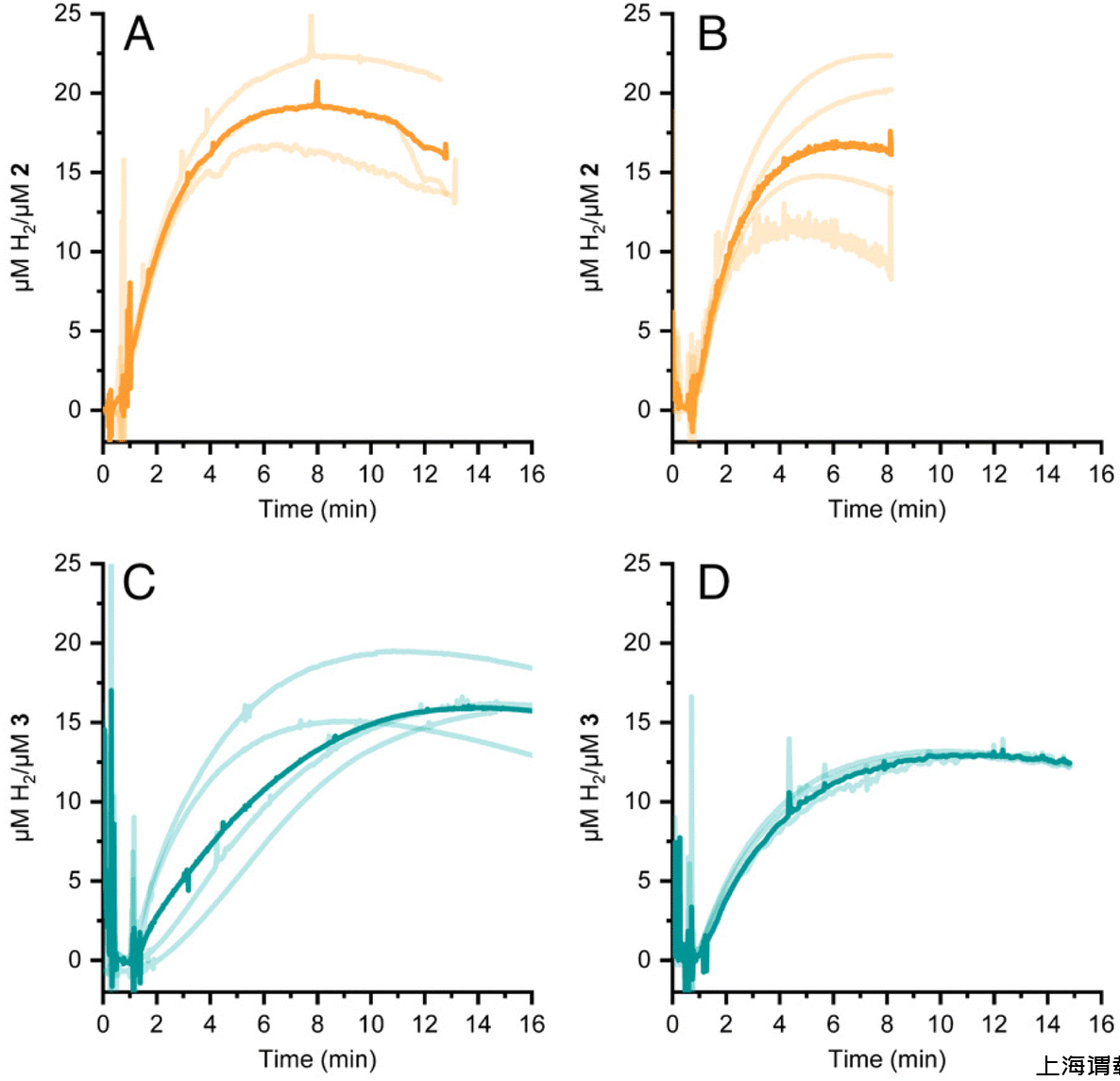 圖4、通過添加化學(xué)還原劑[Eu(EGTA)]誘導(dǎo)的HER 2(面板A和B)和3(面板C和D)。pH值為7(面板A和C)或8(面板B和D)。每個(gè)光跡代表獨(dú)立的檢測(cè);粗體為光線痕量的平均值。