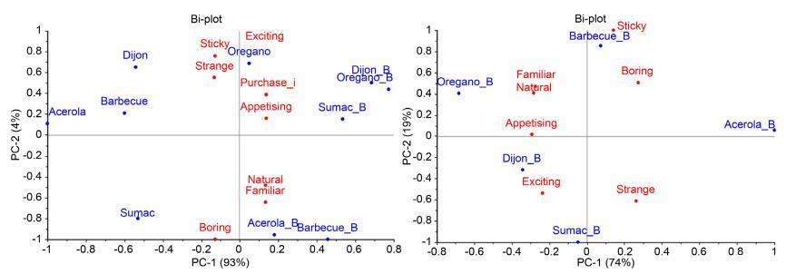 圖2.對10種不同包裝豬排的視覺消費者評估(n=109),包括預腌制或腌料放在塑料袋中(腌料名稱后標記_B)。左圖包含所有樣本,而右圖僅包含腌料放在袋中的樣本。