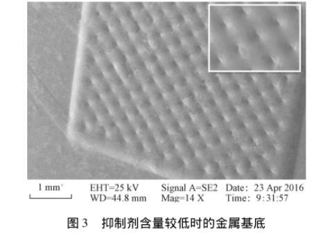 加速劑、抑制劑在電鑄液中的含量對盲孔填充和微電極陣列基板的形成有著很重要的作用,圖3為抑制劑含量較低時,電鑄10 h形成的金屬基底的形貌及其局部放大圖,隨機取點測得對應h=470μm,h'-h=50μm,電鑄填充率為89.3%,填充率較低時會增加后續拋光的工作量,因此,加工過程中需合理控制并根據其消耗量適當補充各類添加劑。