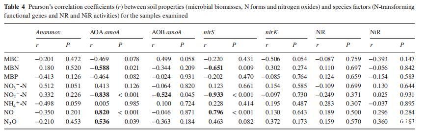 使用Pearson相關(guān)系數(shù)來識別不同比例CAW施用后土壤特性與氮轉(zhuǎn)化功能基因之間的關(guān)系。AOA amoA基因拷貝數(shù)與土壤MBN(r=-0.588,P<0.05)和NO??-N(r=-0.838,P<0.01)呈負相關(guān),而AOB amoA基因拷貝數(shù)與土壤MBC(r=0.546,P<0.05)呈正相關(guān),與土壤NO??-N(r=-0.524,P<0.05)呈負相關(guān)。nirS基因拷貝數(shù)與土壤MBN和NO??-N呈負相關(guān)(分別為r=-0.651和-0.933,P<0.01)。平均土壤NO濃度與AOA amoA和nirS基因的豐度呈正相關(guān)(分別為r=0.820和0.796,P<0.01),平均N?O含量與AOA amoA基因豐度呈正相關(guān)(r=0.536,P<0.05)。NR和NiR活性與土壤特性之間沒有顯著相關(guān)性。