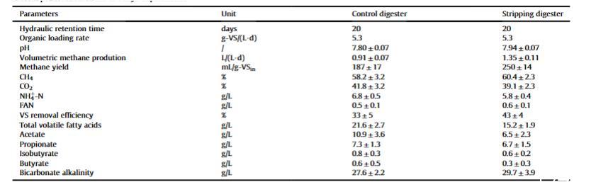 兩個消化器的過程性能如表2所示。對照消化器和剝離消化器中的總銨態氮濃度分別為6.8和5.8 g/L。通常,氨/銨抑制反映在揮發性脂肪酸積累和甲烷產率降低,發生在總銨態氮3-5 g/L。在本研究中,兩個消化器均觀察到揮發性脂肪酸積累,然而,剝離消化器中的揮發性脂肪酸濃度僅為對照消化器的70%。
