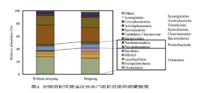 第二豐富的細菌屬屬于Bacteroides sp.(B.cellulosilyticus和B.gallinarum),它們的相對豐度在剝離過程中顯示明顯變化(與對照相比增加27%)。Bacteroides屬成員的代謝多樣性/靈活性及其在可變環境因素下的適應能力先前已被報道。同樣,屬Fermentimonas(特別指F.caenicola)的相對豐度在剝離反應器中增強了2.3倍。F.caenicola最近被建議參與過程的水解和酸化階段。另外,物種Clostridium caenicola和C.populati的相對豐度在剝離消化器中也分別增強了1.8和2.2倍。這些物種能夠利用不同類型的碳水化合物、纖維素和其他糖類生產氫、CO2和揮發性脂肪酸。因此,可以結論,剝離過程可以增強厭氧消化的不同子階段,導致更多產甲烷底物可用于甲烷生產。