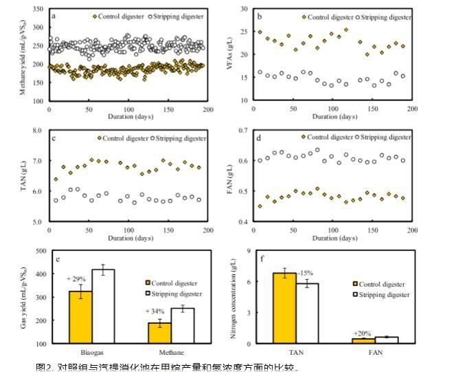 兩個消化器連續運行194天。如圖2所示,與對照消化器相比,剝離消化器中的總銨態氮濃度降低了20%。隨著這種降低,剝離消化器中的沼氣和甲烷產率分別比對照消化器高29%和34%。據報道,在總銨態氮2.1 g/L和投料總固體5%時,雞糞的甲烷產率更高為310 mL/g-VS。因此,仍需要進一步優化以去除更多氨氮并增加甲烷生產。
