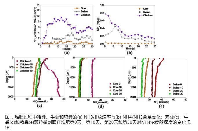 豬糞和雞糞原始樣品的碳氮比接近(分別為8.0和8.3),但它們的NH?排放速率差異顯著。堆肥30天內,雞糞的NH?累積排放量(189.4 mmol)遠高于豬糞(59.2 mmol)和牛糞(12.3 mmol)。這一結果與三種糞便中NH??/NH?含量的順序一致。通過NH??微電極原位檢測,糞便顆粒內部NH??濃度的空間差異不顯著。這一發現可能歸因于NH?揮發和液相再吸收的動態平衡。