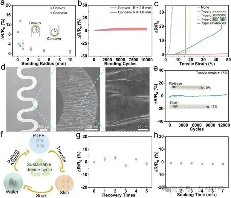 這項技術的真正突破在于其可回收性。研究顯示,轉移后的圖案可通過浸泡水、用聚PTFE薄膜拾取,再重復上述步驟(3)和(4),實現多次重復使用。圖2f-h的數據表明,AgNWs圖案在5次回收循環中電阻變化保持穩定,浸泡數分鐘水不會對AgNWs圖案的電導率產生不良影響。這種可回收特性大大降低了電子皮膚的使用成本,為大規模應用鋪平了道路。