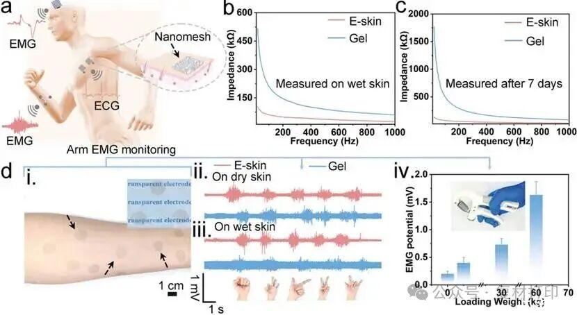 圖3.(a)無基底AgNWs圖案電子皮膚(e-skin),打印于人體多個部位,用于無線采集電生理信號。(b)新鮮制備的電子皮膚與商用新鮮凝膠電極在濕潤皮膚表面的界面阻抗對比。(c)在(b)中同一電子皮膚與凝膠電極在空氣中暴露7天后,于干燥皮膚表面的界面阻抗。(d)前臂皮膚上的透明無基底圓形納米銀線網格電極,用于采集不同手勢產生的肌電信號(EMG):i)皮膚表面銀納米線電極的光學圖像;ii)干燥皮膚、iii)濕潤皮膚下,電子皮膚與商用凝膠電極采集的肌電信號;iv)電子皮膚測量的肌電電位隨握力的變化關系。