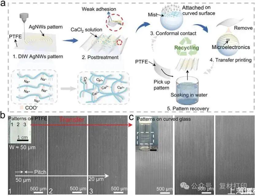 DW&T技術的核心創新在于突破了傳統制造的限制。該技術通過臨時基底打印與溶液調控轉移,實現了無基底導電圖案的精準制備。具體工作流程包含四個關鍵步驟:首先,在室溫環境下,通過直接書寫含納米銀線(AgNWs)的水性墨水,在平面聚四氟乙烯(PTFE)基底上打印AgNWs圖案;其次,用氯化鈣(CaCl?)溶液處理圖案,同時實現海藻酸鈉聚合物鏈的交聯與AgNWs網絡的毛細管焊接;第三,潤濕三維目標物體表面,將帶有圖案的PTFE薄膜共形附著于其上;最后,將圖案轉移至三維曲面,并去除空白PTFE基底。