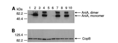 圖3.NsrR對卡他莫拉菌野生型、突變型及回補突變株中AniA蛋白表達的影響。通過Western blot分析,采用多克隆AniA抗血清(A)或CopB特異性單克隆抗體10F3(18)(B)作為一抗對菌株全細胞裂解液進行檢測。泳道1:野生型菌株O35E;泳道2:O35E nsrR突變體;泳道3:O35E aniA突變體;泳道4:O35E nsrR(pWW115);泳道5:O35E nsrR(pWW150);泳道6:野生型ETSU-9;泳道7:ETSU-9 nsrR突變體;泳道8:ETSU-9 aniA突變體;泳道9:ETSU-9 nsrR(pWW115);泳道10:ETSU-9 nsrR(pWW150)。推測的AniA單體和二聚體位置由A圖右側箭頭標示。CopB外膜蛋白作為上樣對照,其位置由B圖右側箭頭標示。各圖左側均標有分子量標準物的位置。