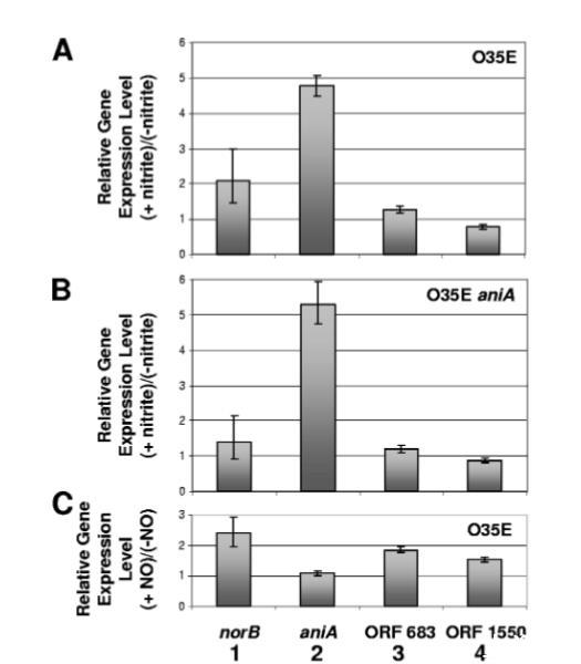 進行qRT-PCR分析以檢測NO??和NO對aniA、norB、MC ORF 683和MC ORF 1550相對表達水平的影響。需要指出的是,用于檢測aniA轉錄本的引物對位于aniA ORF的5'端內部,但在aniA突變體中缺失區域的上游。因此,在qRT-PCR中使用該引物對可以檢測到aniA突變體中截短的aniA轉錄本。