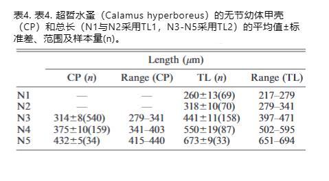 在應用的三種測量方法中,對于大于N3的無節幼體期,第二個全長測量值和頭胸甲長度在識別不同的長度等級時最有用。第一個全長測量值的變異系數通常是第二個全長測量值的兩倍,頭胸甲長度的變異系數最低。無節幼體各期的平均長度見表4。