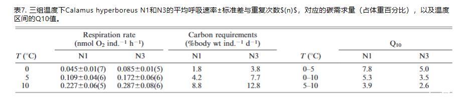 呼吸速率隨溫度和發育階段升高而增加(圖10)。溫度(p<0.001)與發育階段(p=0.05)對呼吸速率的影響顯著,且在5°C時不同發育階段間的差異具有統計學意義(雙因素方差分析,經Holm-Sidak多重比較檢驗)。計算得到不同溫度區間的Q10值較高,范圍在2.6至7.8之間(表7)。在0-10°C條件下,覆蓋基礎代謝的最低碳需求經計算分別為N1期個體體重的1.8-8.8%和N3期個體體重的3.9-12.8%(表7)。