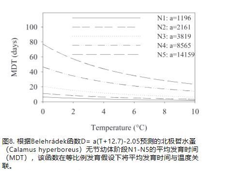 在饑餓處理組中,幼體發育普遍停滯于N3階段(圖7)。然而,仍有高達9%的無節幼體在饑餓條件下發育至N4階段。長期饑餓似乎未影響無節幼體的存活能力,因為實驗結束時投喂組與饑餓組的死亡幼體比例基本相當(分別為77%和66%)。在最初的非攝食階段,投喂組與饑餓組的平均發育時間(MDT)無顯著差異,因此表5展示了所有處理的平均MDT值。從N3階段開始,可觀察到幼體消化道內存在鹽生角毛藻(R. salina)及腸道蠕動現象。每次投喂前對瓶內葉綠素a濃度的三日監測顯示,投喂組與饑餓組的濃度分別為6.3±0.7μg Chl a/L和0.2±0.1μg Chl a/L。發育階段持續時間隨階段晉升而延長,其中最長的N4階段持續14.5天。通過將相對階段持續時間與貝拉赫拉德克胚胎發育時長函數結合,推算出不同溫度下無節幼體的發育時間(圖8)。投喂組與饑餓組的無節幼體日死亡率分別為0.09 d?1和0.04 d?1。