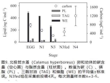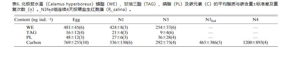 然而,只有在N3與N4之間以及卵與N3之間,觀察到的碳含量差異是顯著的。投喂4天的N3其碳含量比饑餓的N3高出59%。C. hyperboreus 卵的總脂質含量為每卵0.55微克,約占碳含量的72%,以及卵干重的46%(使用體積與干重轉換因子0.29皮克碳/立方微米計算得出)。蠟酯是主要的脂類,在所有階段均占總脂質的85-90%。TAG的含量相當低,占3-4%;磷脂占總脂質的6-12%,而甾醇的濃度低于檢測限。從卵到N3,蠟酯和TAG的脂質總量呈普遍下降趨勢,但磷脂沒有。蠟酯的下降最為顯著,從卵到N3消耗了47%。孵化導致蠟酯減少12%(每天3.8%),而卵中儲存的蠟酯有35%在從N1發育到N3的過程中被消耗(每天4%)。對于TAG,趨勢略顯模糊,從卵到N1濃度初始上升,隨后從N1到N3下降。總體而言,階段、脂類以及階段與脂類的交互作用的影響均顯著。階段間的差異僅在蠟酯內顯著,脂類間的差異在蠟酯與磷脂以及蠟酯與TAG之間顯著。