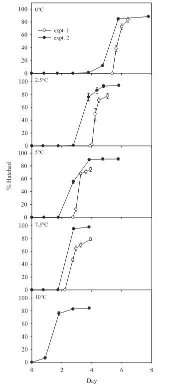 總的來說,兩個實驗中卵的孵化成功率都很高,實驗1在75%到83%之間,實驗2在88%到98%之間。實驗1中0-7°C下卵的平均發育時間在5.8到2.8天之間,實驗2中0-10°C下在5.3到1.7天之間,兩個實驗中溫度的影響均顯著。盡管實驗2的溫度略低,但在所有溫度下卵孵化都顯著快于實驗1。為兩個實驗中不同溫度區間計算的溫度系數Q10在2.6到5.4之間,其中從0°C到2.5°C的值最高。應用Belěhrádek函數對數據進行了顯著擬合,兩個實驗中r2 > 0.99。