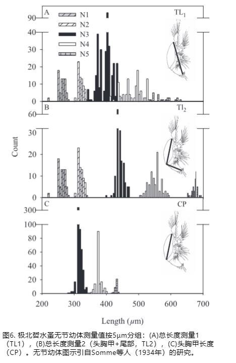 在40天的實驗期間,投喂處理中的無節幼體發育到N5,而在饑餓處理中,發育通常停滯在N3。