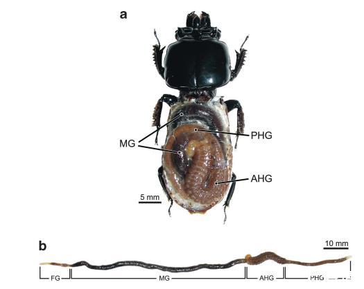 圖1a顯示了O.disjunctus腹腔內的背側腸道排列。FG位于頭部和部分胸腔內(未解剖)。盤繞的MG、AHG和PHG位于腹腔內。盤繞的MG(圖1b)從胃盲囊延伸到馬氏管。向后,腸道突然變寬成一個囊袋區域,即AHG,它位于一層氣管管上方(不可見);細長的PHG緊鄰AHG后方,同樣被氣管管包圍。整個背側腹腔被一層厚厚的角質層覆蓋,并由一對翅膀(已移除)保護,這對翅膀鎖在一起,僅在飛行時打開,而該物種很少飛行。整個腸道的典型長度約為11厘米,FG是最短的區域,MG是最長的區域。