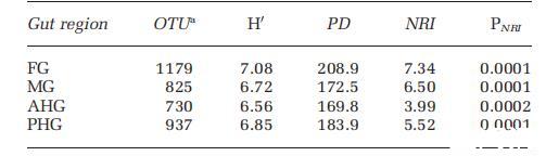 為了檢驗每個腸道區域作為不同環境過濾器的假設,我們評估了每個腸道區域的系統發育聚類。系統發育聚類由NRI表示,其中增加的正值代表群落按系統發育親緣關系更聚集,而增加的負值代表更分散的系統發育信號。我們的結果表明,每個腸道區域內的群落都顯著聚集,FG和PHG區域顯示出最大的聚集性(P<0.001;表1)。