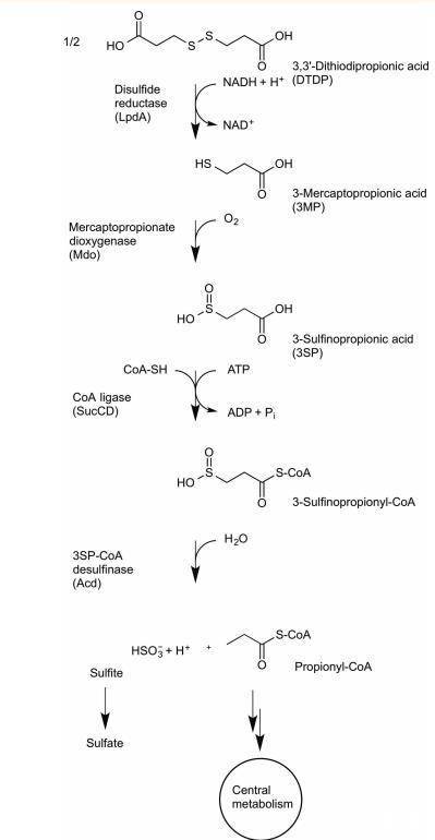 圖1 DTDP 的降解過程。二硫鍵化合物3,3‘-二硫代二丙酸(DTDP)通過NADH依賴性二硫鍵還原酶(Wu¨bbeler等,2010)裂解為兩個(gè)3-巰基丙酸(3MP)分子。3MP經(jīng)雙加氧酶(Mdo;Bruland等,2009)氧化生成3-亞磺酰丙酸(3SP)后,琥珀酸-CoA連接酶(SucCD;Schu¨rmann等,2011)催化其活化為3SP-CoA。隨后,3SP-CoA被亞磺酸脫氫酶(Acd)催化水解裂解,生成丙酰輔酶A和亞硫酸鹽。丙酰輔酶A最終通過甲基檸檬酸循環(huán)進(jìn)入中心代謝途徑,而亞硫酸鹽很可能被亞硫酸鹽氧化酶氧化為硫酸鹽。
