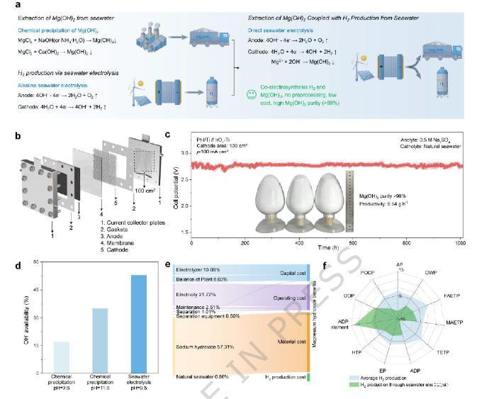 圖5、放大規(guī)模天然海水電解的性能與技術(shù)經(jīng)濟(jì)分析(TEA)。a.三種策略的示意圖:從海水中提取Mg(OH)?、通過海水電解制氫、以及從海水中耦合提取Mg(OH)?和制氫。b.100 cm2流通型電解槽的內(nèi)部結(jié)構(gòu)圖。c.天然海水電解槽在25°C、100 mA cm?2電流密度下的穩(wěn)定性測(cè)試,插圖為在此過程中獲得的Mg(OH)?。d.化學(xué)沉淀法和海水電解法合成Mg(OH)?的OH?利用率比較。e.天然海水電解總成本與收益的簡(jiǎn)要?jiǎng)澐帧.基于海水電解的鎂提取與氫氣生產(chǎn)過程的生命周期評(píng)估(LCA)。